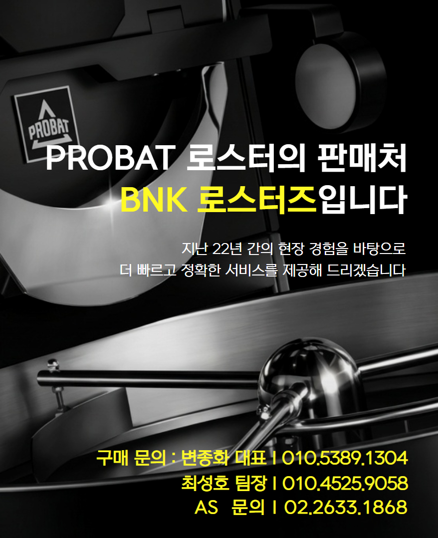 BNK 로스터즈는 독일 명품 로스터 PROBAT의 수입 판매원입니다. 2004년도부터 현재까지 1,000여 대가 넘는 로스터기와 생산 설비들을 로스터리 카페, 원두 공장, 식품 연구소 등에 납품하였습니다. 20여 년간 쌓아온 노하우와 성실함 그리고 신속한 서비스와 더불어 로스터기에 관한 모든 제반 업무를 고객의 시선과 입장에서 도와드리고자 최선을 다하고 있습니다.