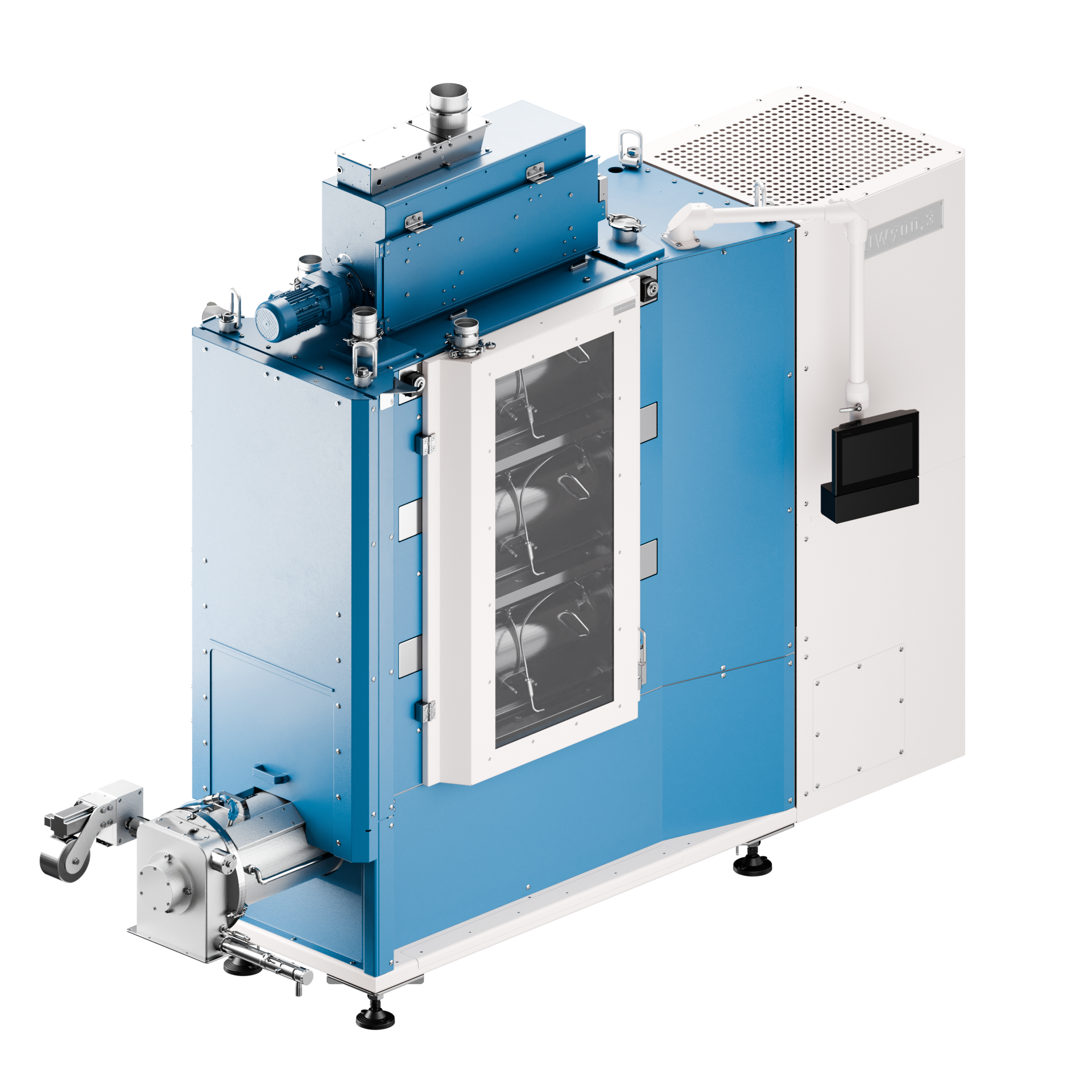 모든 PROBAT 롤 그라인더에는 커피 채프를 추가로 분쇄하고 전체 제품을 균일하게 혼합하는 수냉식 터보 믹서가 장착되어 있습니다.