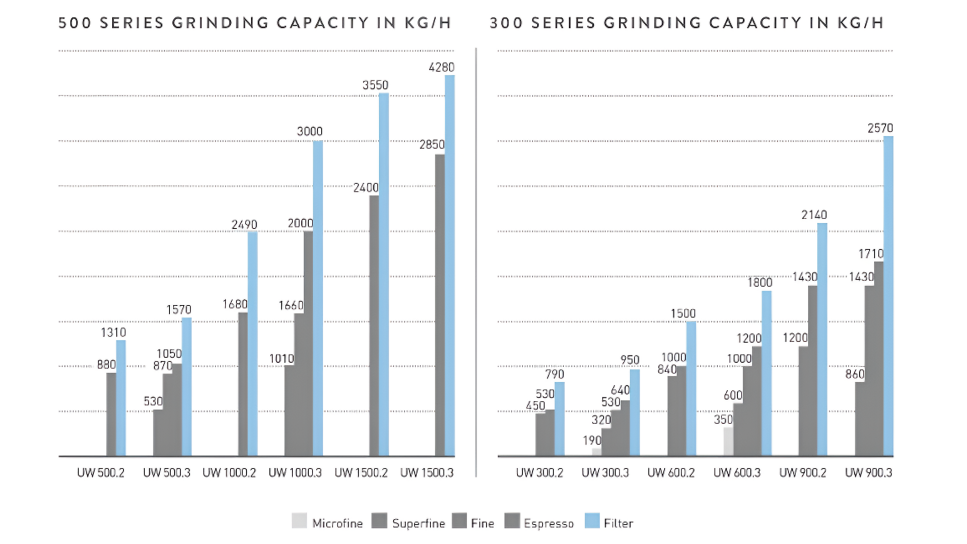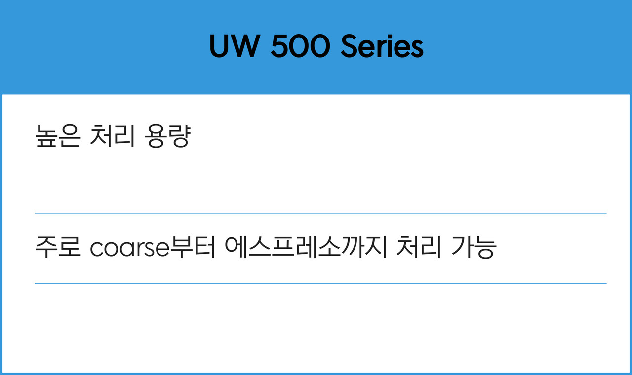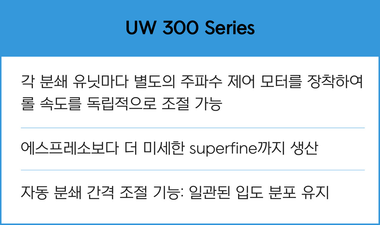 UW 롤 그라인더는 두 쌍 또는 세 쌍의 롤을 장착하며, 서로 반대 방향으로 회전하는 2개의 롤 사이를 통과하면서 커피가 분쇄됩니다.