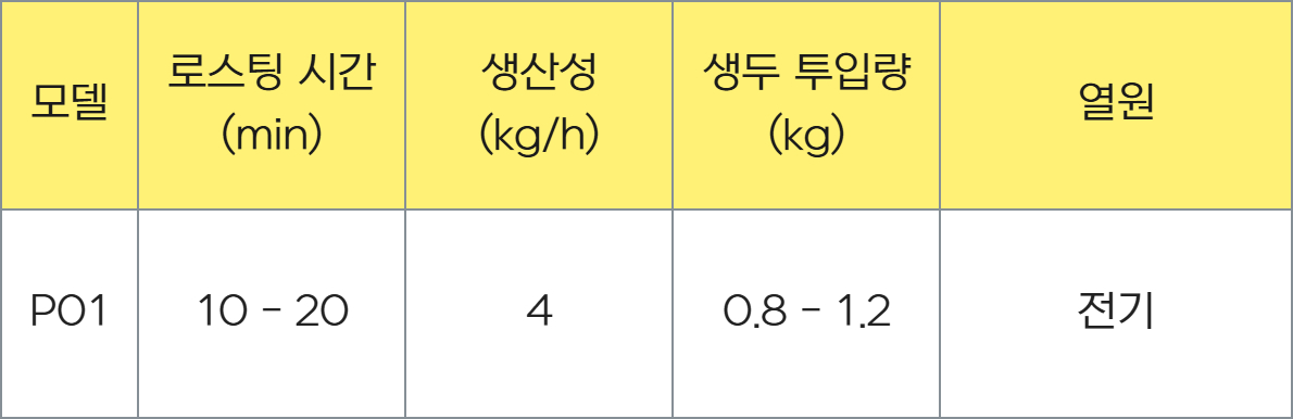 P 시리즈의 가장 작은 모델인 P01은 아주 특별한 스페셜티 커피같이 소량의 커피를 볶을 때 아주 적합합니다. Probatino의 후속 모델인 P01은 다른 P 시리즈 로스터들과 마찬가지로 PROBAT의 상징적인 디자인과 인상적인 구조 설계가 잘 결합된 걸작품입니다.