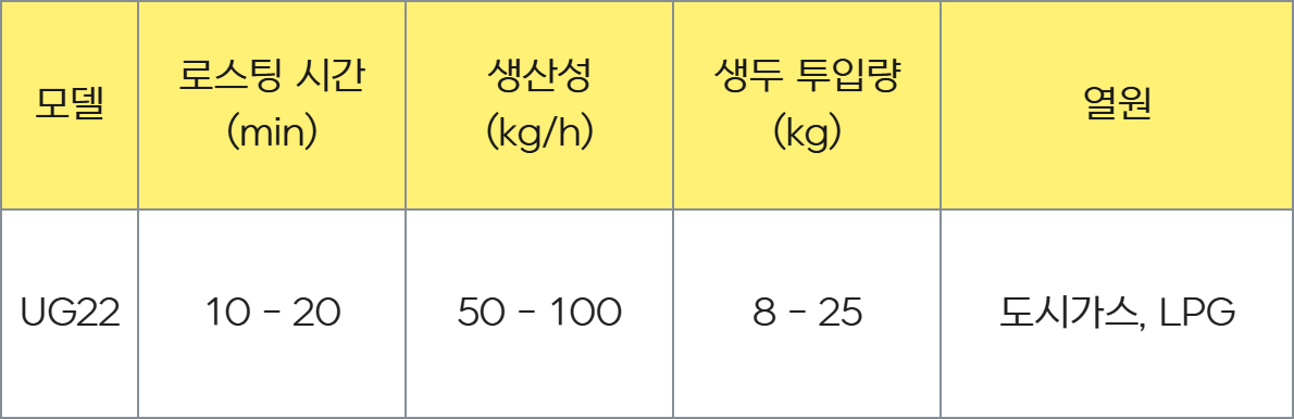 독보적인 특징은 특유의 "아로마 휠(Aromar wheel)"입니다. 아로마 휠을 간단히 회전시켜 열풍의 흐름과 풍량을 정밀하게 수동 제어할 수 있어, 다양하고 미묘한 로스팅 프로파일을 구현합니다. 특히 UG 22 모델은 전통적인 로스팅 기술과 일관되고 재현 가능한 커피 품질을 완벽하게 조화시킵니다.